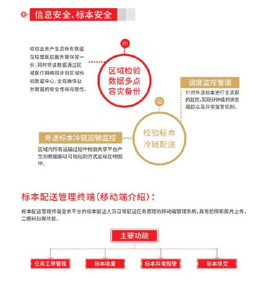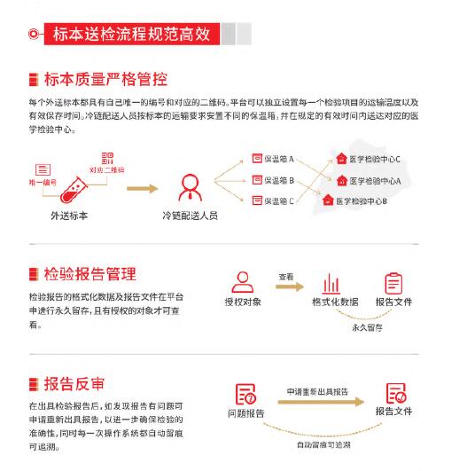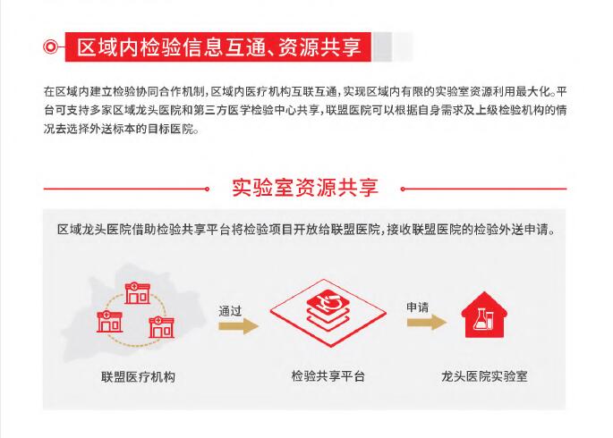 平台具有规范化的基础检验业务管理、专业的检验标本冷链输送、便捷的患者查询服务和全方位的医疗检验监管,可为区域医疗机构间的业务往来提供专业、安全、可信赖的集约化医学检验共享服务,全面提升区域医学检验服务水平。